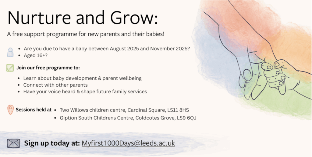 Parents and Caregivers (16+) who are due to have a baby between August and November 2025 and have a Leeds postcode can contact us using our contact form to join one of our groups.